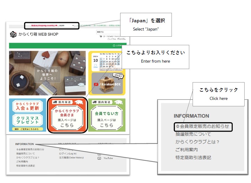 please select "Japan" as your SHIPPING address* on the top of page and enter the shopping page from "からくりクラブ会員様購入ページはこちら".